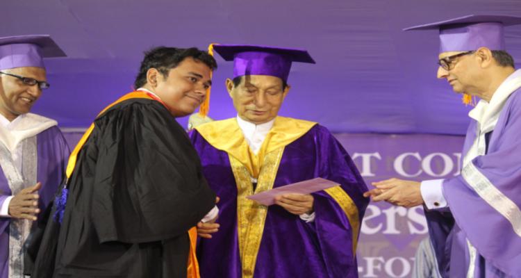 The convocation ceremony began with a welcome note by the Registrar, Fr. Antony Uvary, S.J., followed by the Vice-Chancellors report by Fr. Paul Fernandes, S.J. and the Chairman’s address by Shri. Rajive Kaul. The meritorious students were presented with medals by His Excellency Dr. S C Jamir followed by the presentation of graduates of various courses by the respective Deans. The degree/diploma was awarded by Shri Rajive Kaul and the presidential address was delivered by His Excellency Dr. S C Jamir.